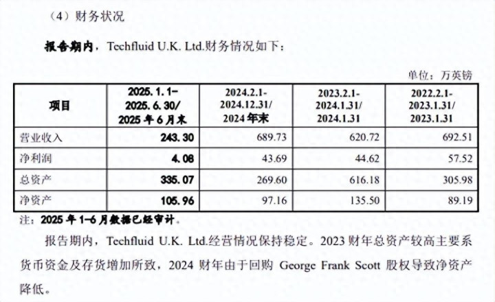 收购实控人控制的企业,曾是第一大客户。2022年至2024年,TechfluidU.K.Ltd(英国泰悦)均为悦龙科技前五大客户,其中2022年、2023年为第一大客户、2024年为第三大客户,该时期销售额分别为2,970.25万元、4,292.04万元、2,250.44万元,占比分别为15.72%、19.63%、8.41%,2025年上半年消失在前五客户之列(2024年为1-10月数据)。